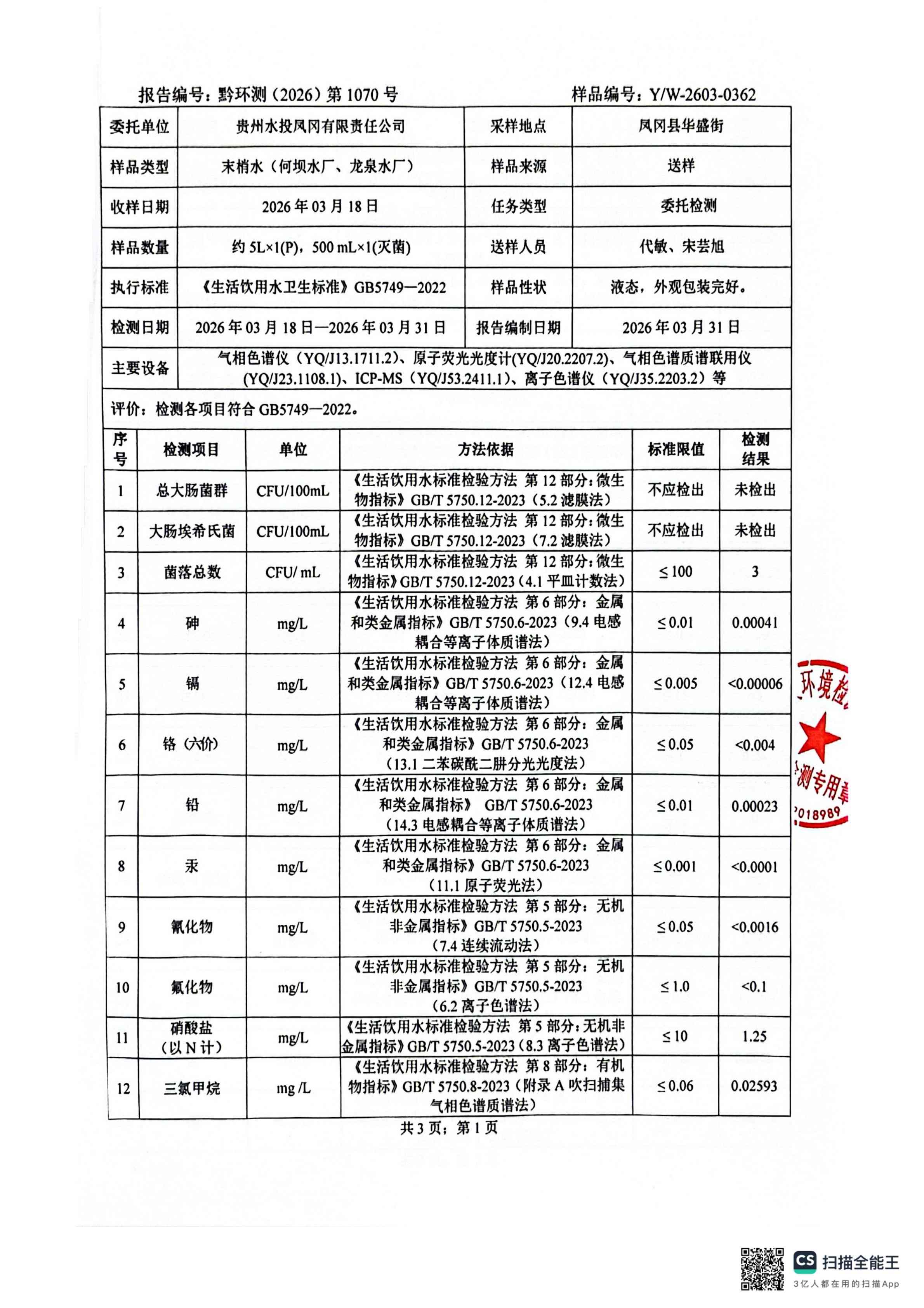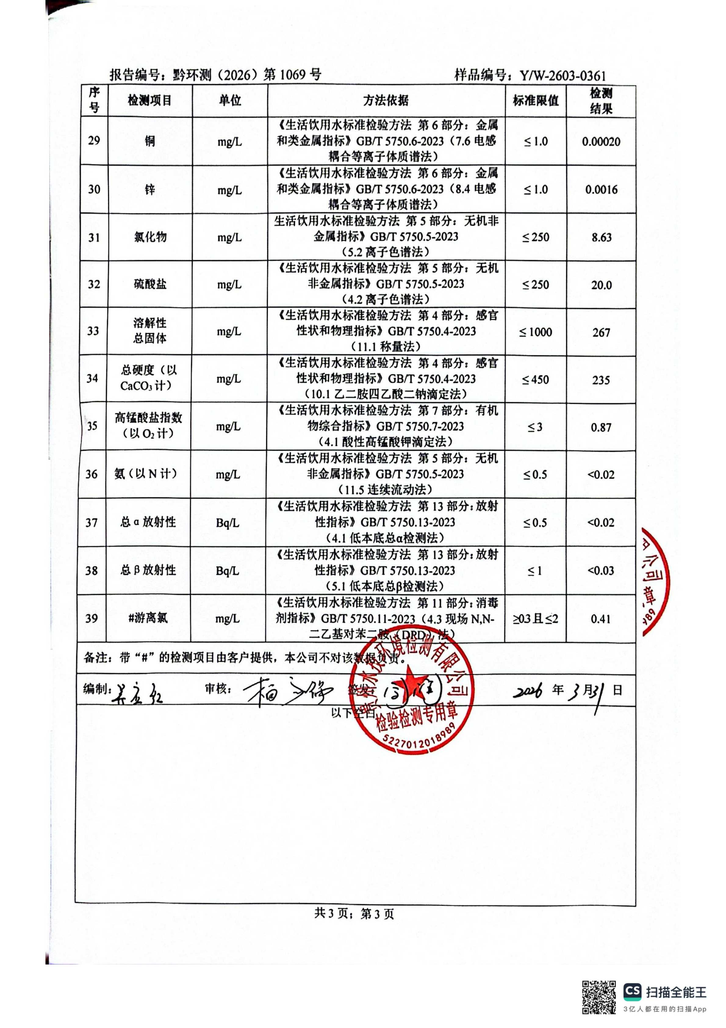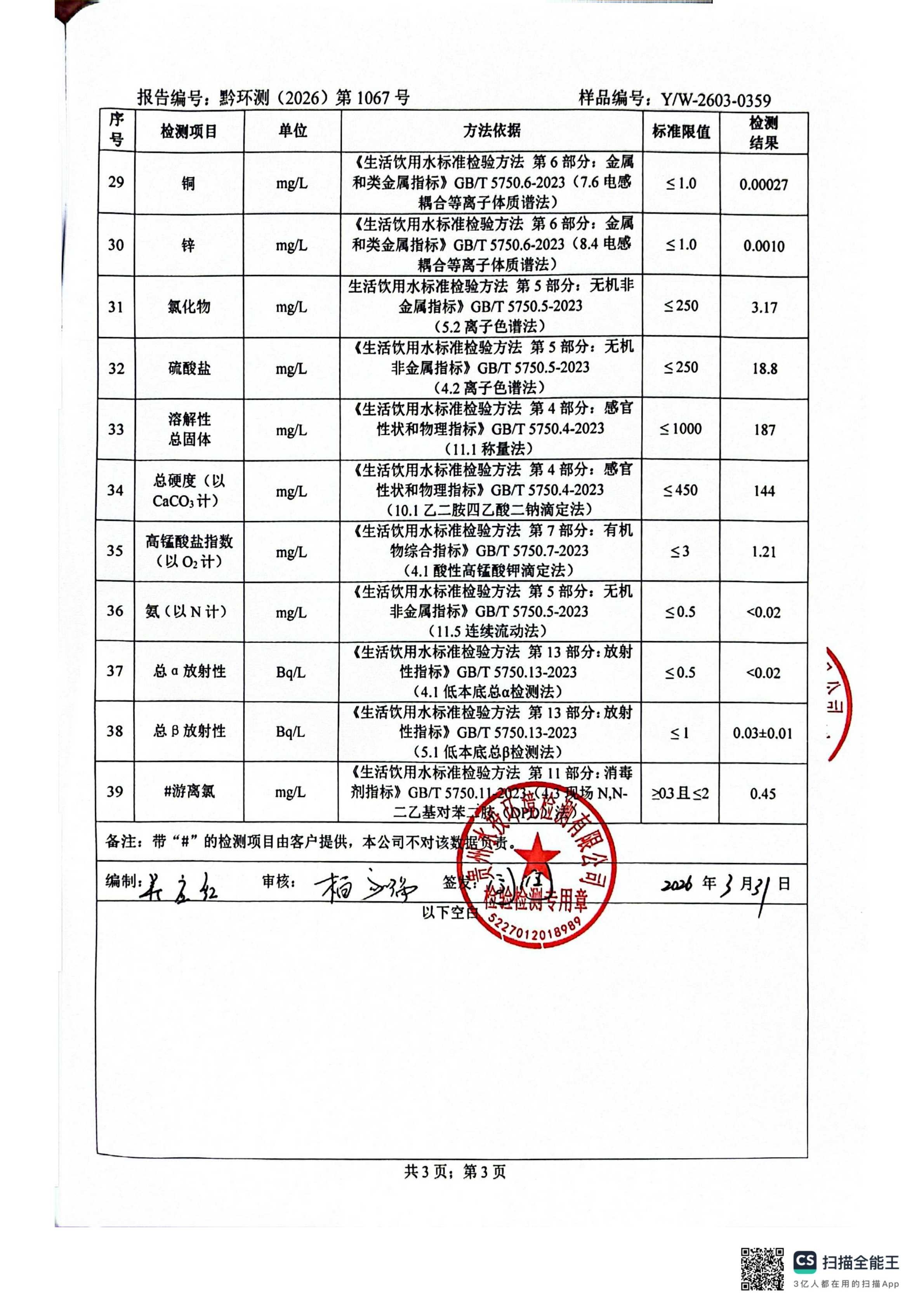 2026年3月城区水质检测报告