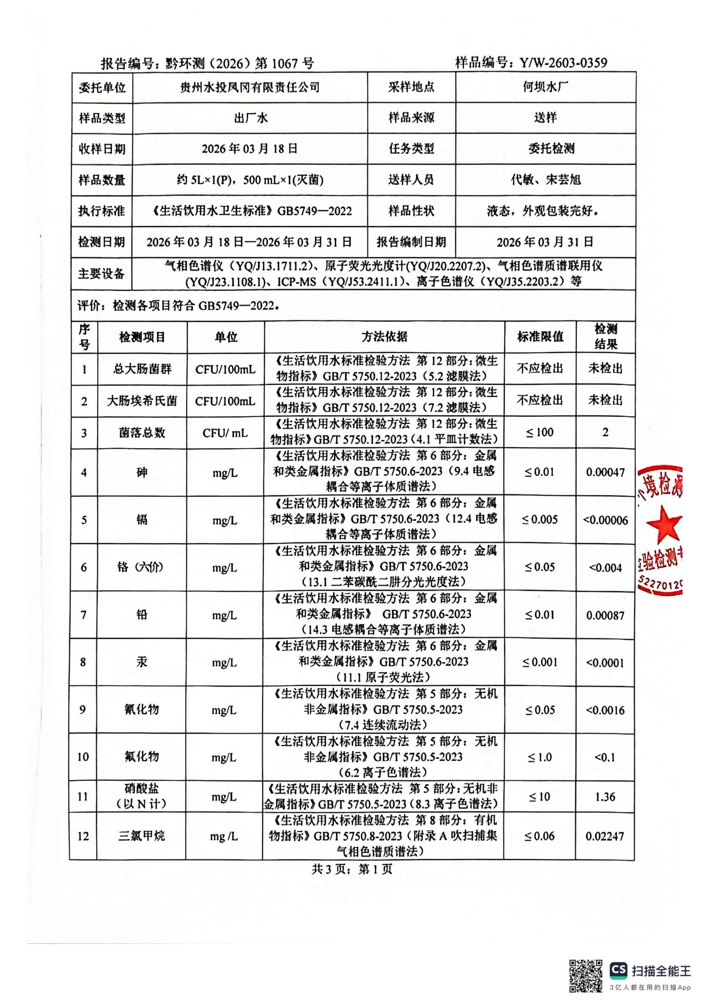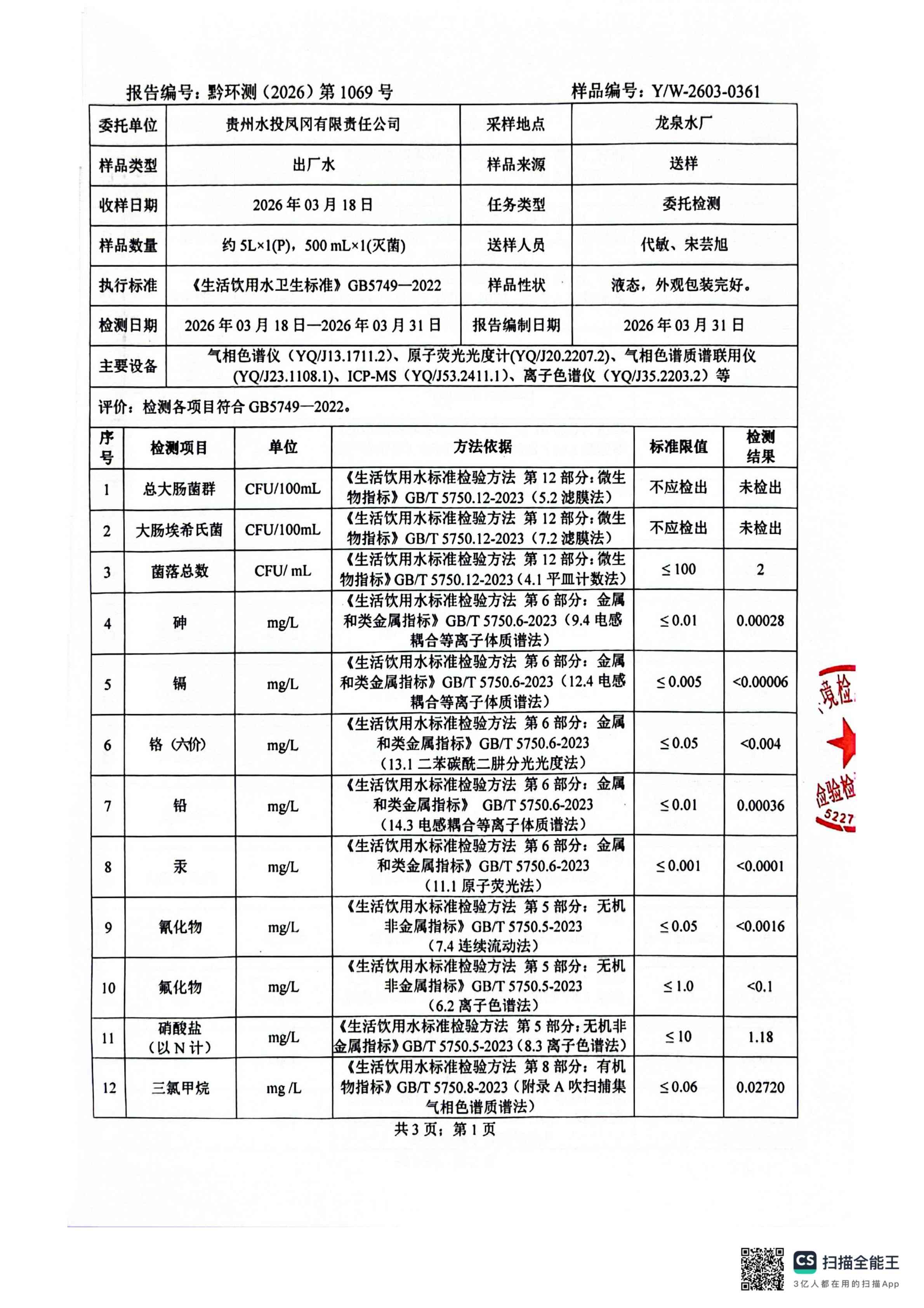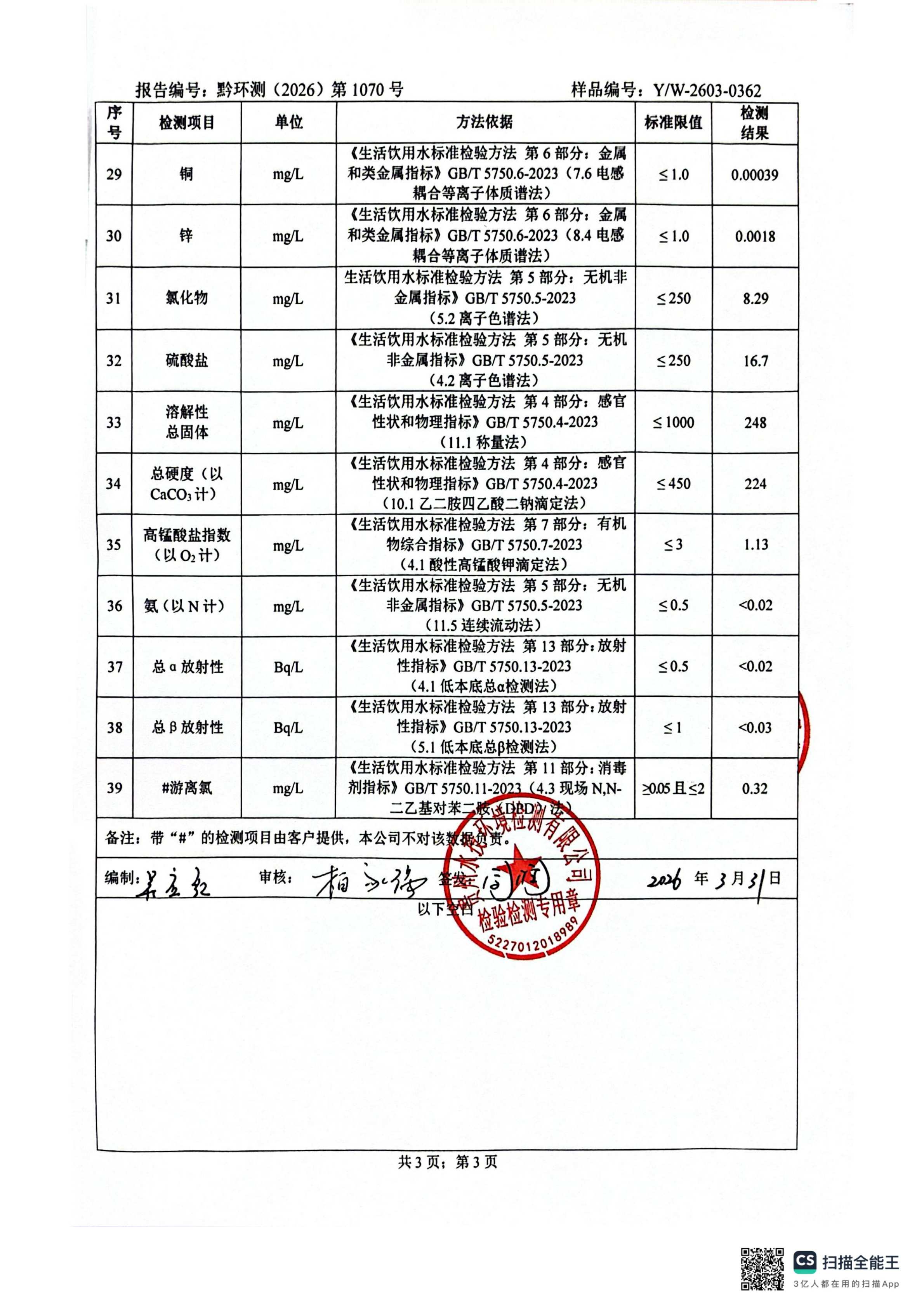 2026年3月城区水质检测报告